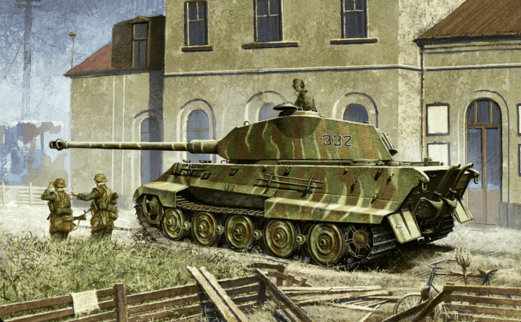 Tiger II «número táctico 332» con torre Porsche y Zimmerit, 3/s.Pz.Abt. 503, Mailly-le-Camp, Francia, 1944, avanza apoyado por la infantería de las Waffen-SS. Box art Dragon, Todas las fotografías conocidas del Tiger II «número táctico 332» con números negros probablemente fueron tomadas en los campos de entrenamiento cerca de Mailly-le-Camp, Francia, a principios de agosto de 1944. Durante la Batalla de Colombelles el 11 de agosto, el comandante de la 3.ª Compañía del 503.º Batallón de Tanques Pesados (503rd Heavy Panzer Battalion’s 3rd Company) el Leutnant von Rosen, dirigió un ataque nocturno en el que participaron 12 Tiger II contra una formación de unos 20 tanques Sherman. Menos de cinco minutos después de que comenzara el enfrentamiento, 12 Sherman explotaron o se incendiaron y dos más fueron abandonados por sus tripulaciones; los demás se retiraron. No hubo pérdidas alemanas.