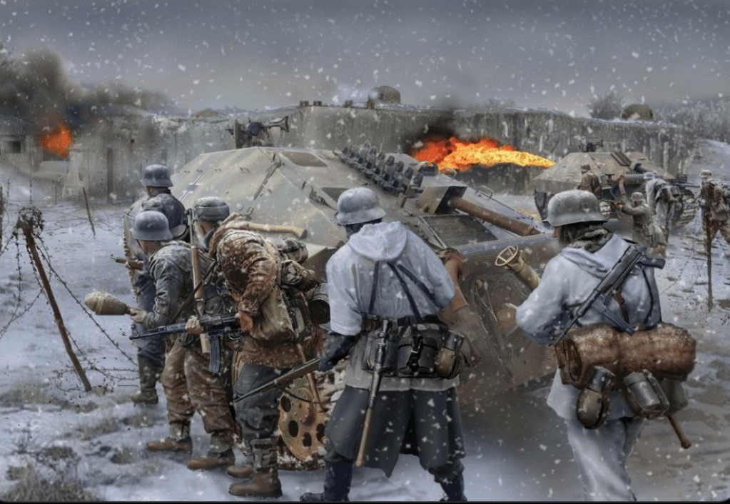 Operación Nordwind, de Jim Laurier. Granaderos alemanes se cubren tras un Hetzer durante un asalto.