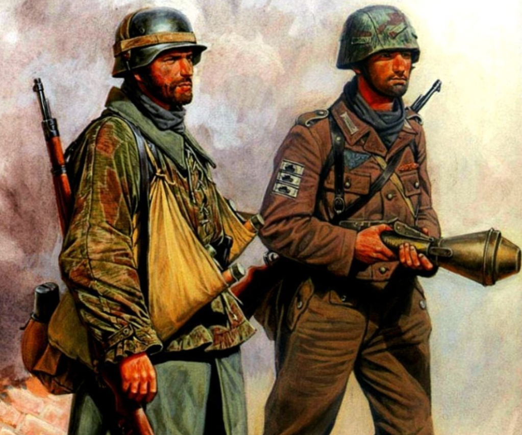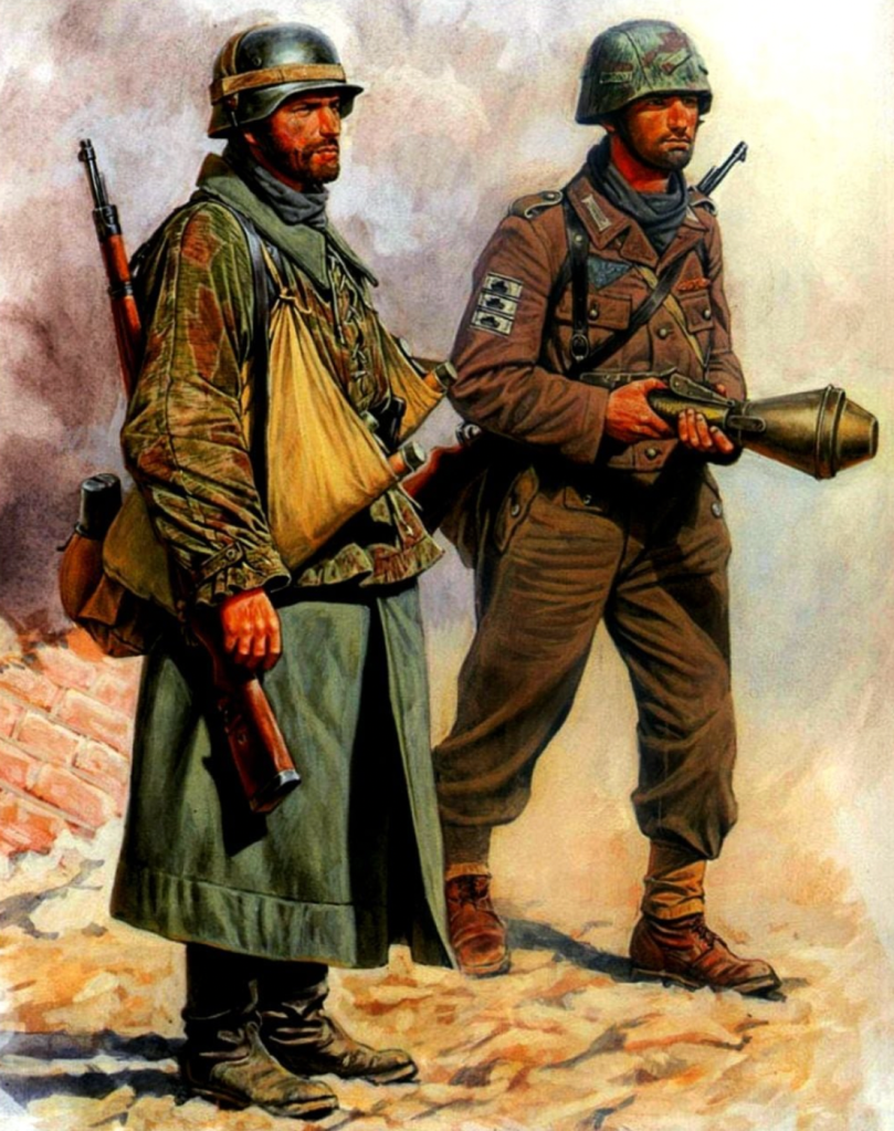 Dreta: Soldat d’infanteria de la Wehrmacht de la Brigada antitanc “Friedrich”. Aquesta unitat destruïa els tancs soviètics mitjançant llançacoets i granades. Aquesta unitat es va formar amb milicians i soldats de la Wehrmacht (de les unitats donades d’alta o llicenciades). Porta al braç tres cintes amb la Tank Destruction Badge en plata, una per cada tanc destruït, i que testifiquen que es tracta d’un soldat experimentat. Està equipat amb una carabina 98K de 7,92mm i un Panzerfaust.