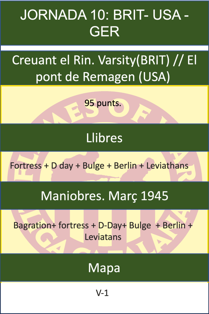 USA El pont de Remagen: Al febrer de 1945 les forces Aliades de l’oest es reunien per a l’avenç final cap a Alemanya. Al nord es van reunir les tropes de l’11è Grup de l’Exèrcit del Mariscal de Camp Bernard Montgomery, al sud, el 12è Grup de l’Exèrcit del General Omar Bradley. Incloïa el Tercer Exèrcit dels EUA, comandat pel General George Patton. El 8 de febrer, el Grup de l’Exèrcit de Montgomery va llançar un atac a les Forces Alemanyes que defensaven el Rin. La força del nord va haver de lluitar al camp ple d’arbres, mentre que la força del sud es va endarrerir perquè els alemanys van deixar anar aigua de una sèrie de preses per inundar els voltants. Passarien dues setmanes perquè les dues forces es reunissin a la riba occidental del Rin.A principis de març de 1945, les forces de Montgomery controlaven noranta quilòmetres de la riba occidental del Rio Rin, la següent tasca era creuar-lo. Al sud de les forces de Montgomery, l’Exèrcit de Bradley també avançava cap a l’est a la recerca d’una via de l’altre costat del Rio. El 7 de març de 1945, van arribar al Rin a Cologne, no obstant això Hitler va ordenar destruir tots els ponts. Però conforme les forces dels EUA exploraven més al sud, van trobar un pont intacte a la ciutat de Remagen. Van sortir corrents cap a ell, vencent la resistència dels alemanys. Just quan estaven a punt de creuar-lo, hi va haver una explosió. Però en contra dels pronòstics, el pont va romandre dret. Un petit grup de nord-americans el va recórrer tallant desesperadament els cables que semblaven de demolició. Comandants dels EUA van creuar amb els seus homes el més aviat possible. Els aliats van penetrar per fi el centre d’Alemanya. A Berlín, la notícia de la captura del pont a Remagen va enfurismar Hitler. Cinc oficials van ser jutjats al Consell de Guerra ia quatre els van afusellar. A més, el comandant alemany que més va patir a l’Oest, el Mariscal de Camp Gerd Von Rundstedt va ser acomiadat, sent la segona vegada que li succeïa en menys d’un any. El va substituir el Comandant veterà Mariscal de Camp Albert Kesselring que havia estat al capdavant a l’Àfrica del Nord i Itàlia.